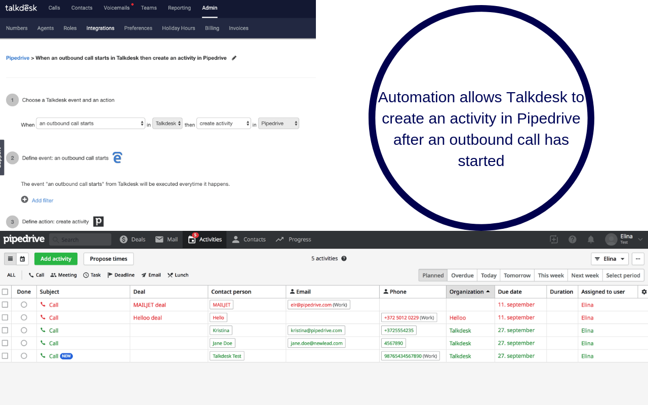 The integration automatically synchronizes contacts, activities and notes between Pipedrive and Talkdesk in real-time. This can be customized according to your businesses’ needs. Furthermore, Talkdesk’s automated workflows eliminate the need to enter data in two different systems manually. Simply configure specific Talkdesk events to trigger actions in Pipedrive automatically.