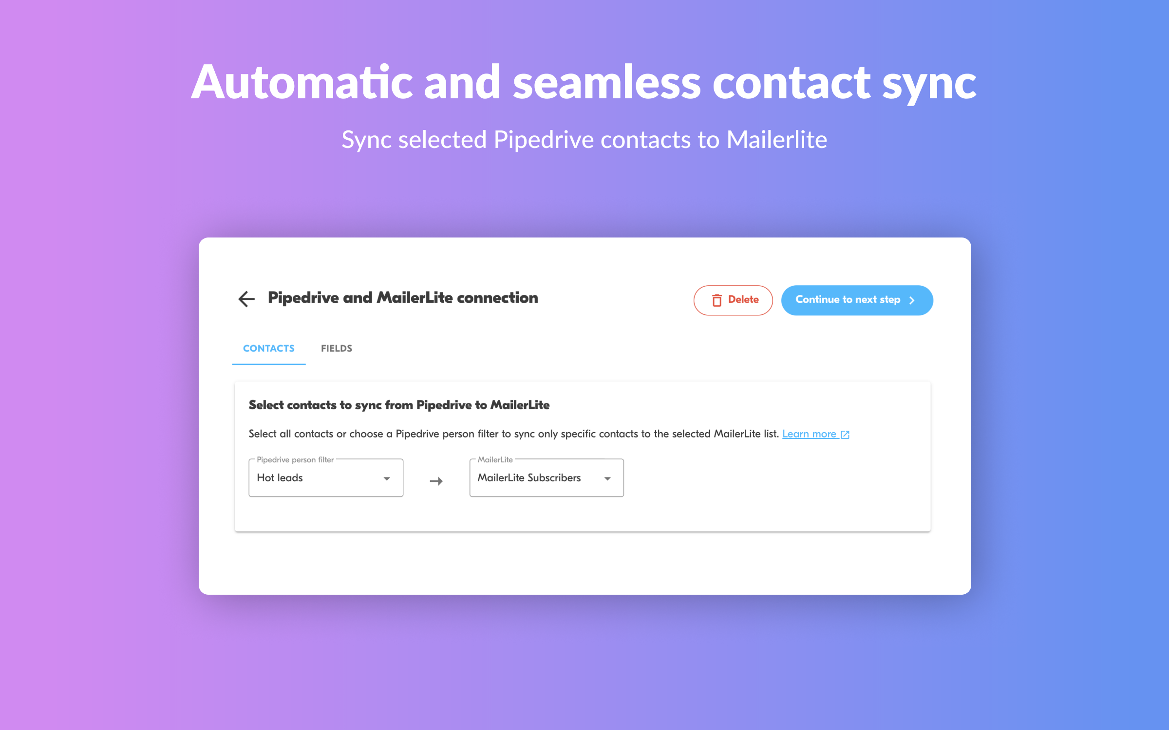 Outfunnel's Pipedrive to MailerLite connection provides a seamless contact sync that can be set up in minutes.