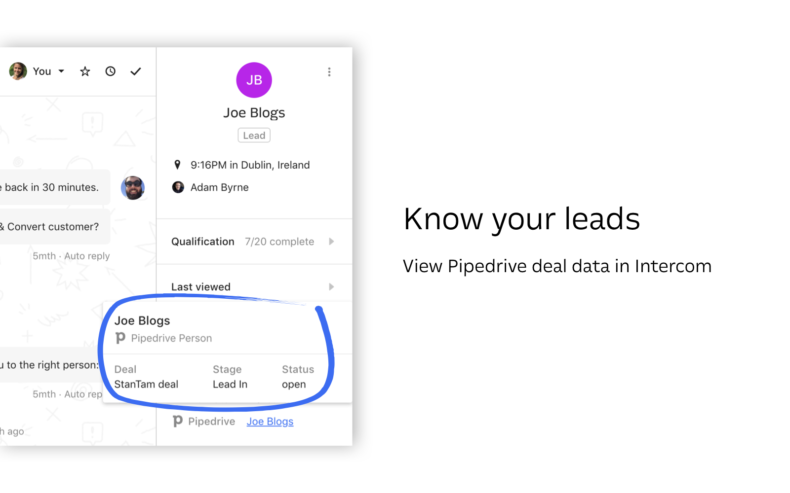 You can also view details about a lead's Pipedrive deal in your Intercom Inbox, so you have all the context you need when chatting with a lead. Plus, your conversation is automatically logged in the lead’s timeline on Pipedrive – giving you a complete picture of the lead’s journey so that you can pick up your sale right where you left it.