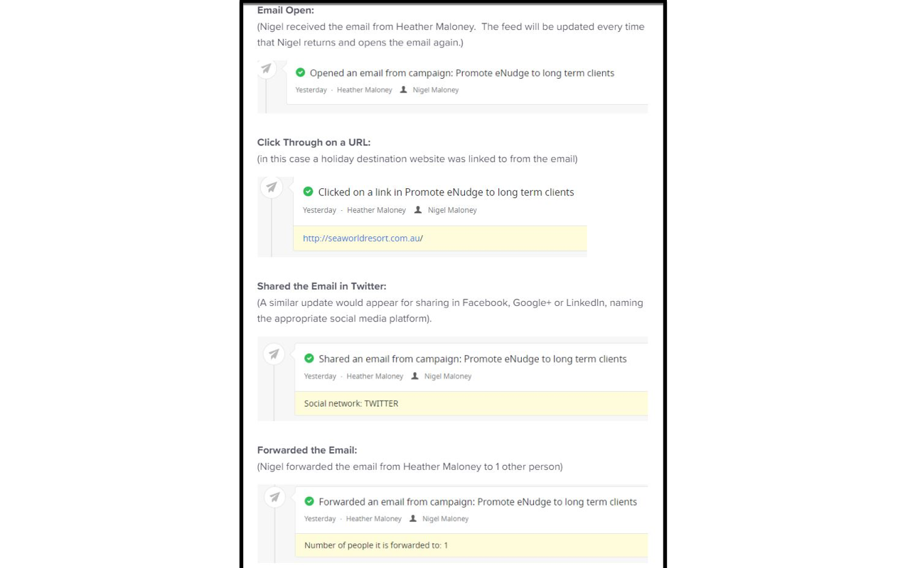 The Enudge integration makes it simple to import contacts from your Pipedrive account into Enudge, then update your Pipedrive contact whenever they open, click on a URL, share your email in social media, or forward it on.